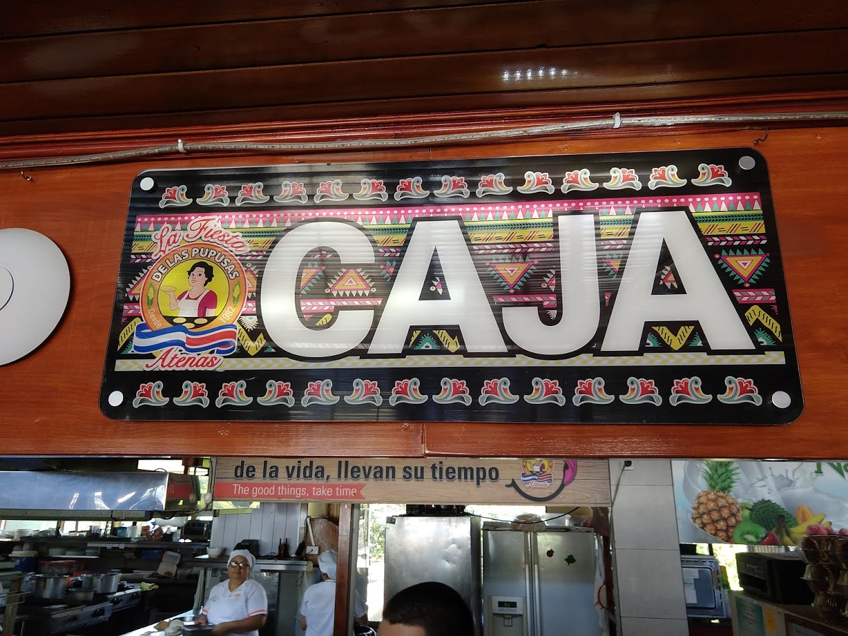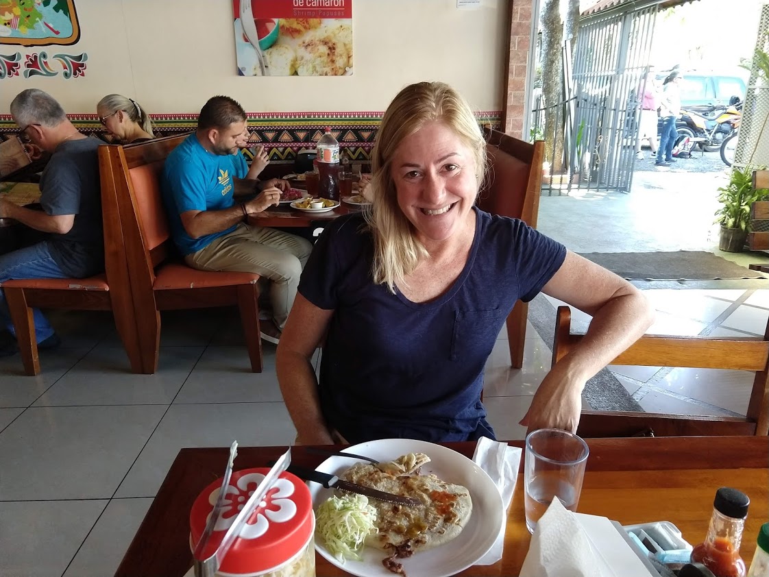 We watched how everyone paid and determined that the checkout process was to go to the Caja at the back of the restaurant and give them your table number, which they would use to look up your bill. Confirming that we were table fourteen I confidently strode to the back of the line and watched two guys in front of me checkout. When it was my turn I said “Catorce”. Once again I got a question I couldn’t parse so I admitted I’m just starting to learn Spanish. I gave him my best “Como se llama?” and learned that his name is Alfonso. He told me in slow Spanish that our bill was 6900 Colones ($11.50). I paid and we chatted for a bit. I told Alfonso (yup, we’re now on a first name basis) how much we’d enjoyed the meal and the lesson in how to eat pupusas. He told me that the next time we MUST try their fresh fruit drinks as they take the pupusas to the next level. I pointed at Jill told him we would be back soon to try the full experience. I also asked how the guy in the yellow vest directing traffic gets paid and he said he works for tips (which makes me think I should have tipped the yellow vest guys in our earlier encounters).