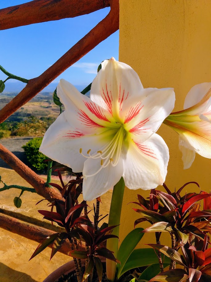 Jill and I had coffee on the upper patio so that we wouldn’t wake Jackie (who has not been going to bed at 8:30PM for the last three weeks). I’ve been watering the potted plants on the upper deck every day and am now being rewarded by a very happy amaryllis.