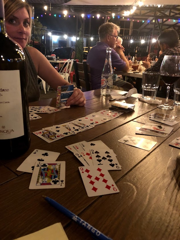 Because we had a bunch of wine to drink and I was driving we tarried over a very pleasant dinner. After dinner we played three handed gin rummy and then shared a piece of tres leches cake with a passion-fruit glaze. Sounds odd, but it was delicious!